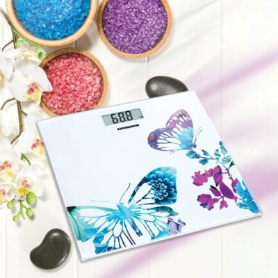 Cantar de baie Heinner Butterfly 150 HBS-150BTF, platforma din sticla securizata de 6 mm, capacitate maxima: 150kg, display LCD, gradare: 100g, pornire / orpire automata, indicator baterie descarcata, indicator depasire greutate, baterie inclusa: 1 x CR2032 Li