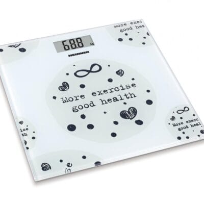 Cantar de baie Heinner Ideal 150 HBS-150MSJ, platforma din sticla securizata de 6 mm, capacitate maxima: 150kg, display LCD, gradare: 100g, pornire / orpire automata, indicator baterie descarcata, indicator depasire greutate, design cu mesaj motivational, baterie inclusa: 1 x CR2032 Li