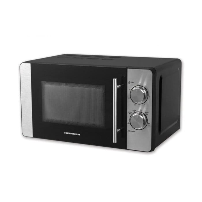 Cuptor cu microunde Heinner HMW-20MBKSS, Capacitate 20L, Control mecanic, Display LED, Putere cuptor 700W, 6 trepte de putere, Timer, Timp maxim de gatire 30 min, Functie decongelare, Semnal sonol la finalizarea programului, Diametru platou rotativ 245mm, Dimensiuni ( LxAxI): 45.1×34.5×25.8 cm, Culoare: Negru-Inox