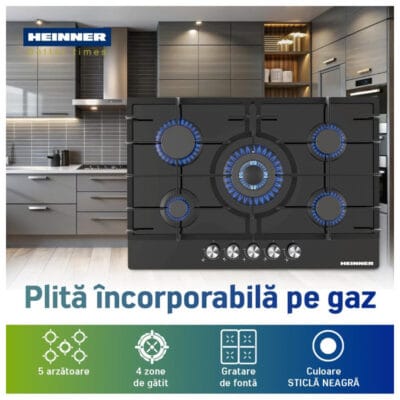 Plită gaz Heinner HBH-M705IWFGBK încorporabilă – eleganță, putere și control în bucătărie